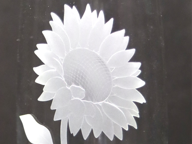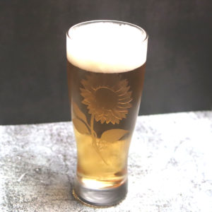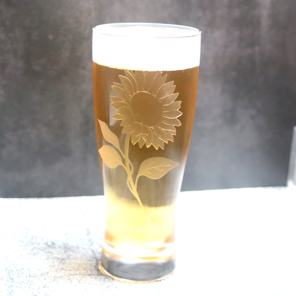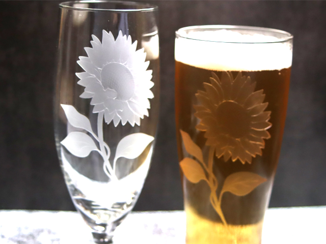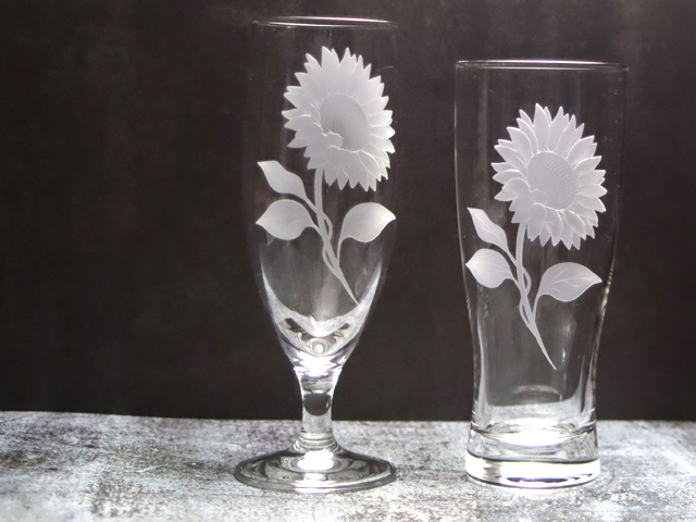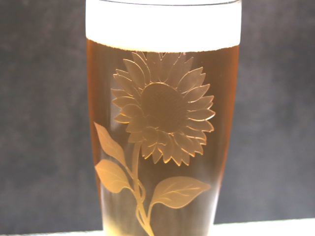 ビールやジュースにぴったりな、ピルスナーのグラスに、ひまわりの花を彫りました。